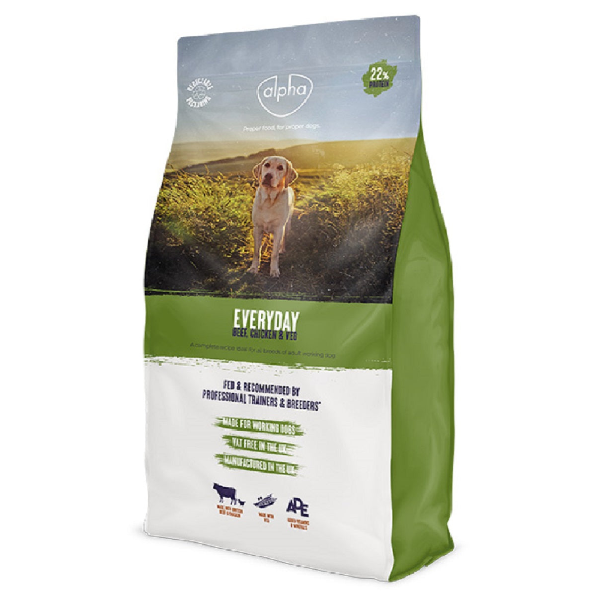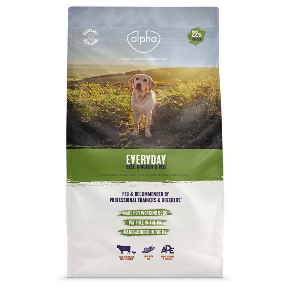 Alpha Everyday contains beef, chicken & veg. It is a nutritionally complete and balanced food for all breeds of adult dog.