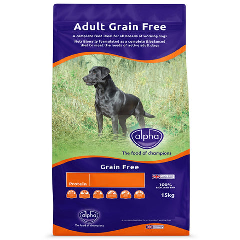Alpha Grain Free is made with chicken, potato & veg. It is a hypoallergenic formula for active adult dogs, with no added grain, soya or dairy. Our recipe includes prebiotics to help support digestive health, as well as linseed to aid healthy skin and coat condition.