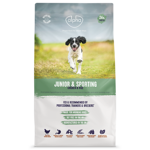 Alpha Junior and Sporting has been carefully formulated as a complete and balanced diet for young dogs from the age of 6 months old. This food comes in a larger kibble than our puppy diet for pups over 6 months old who require adult nutrition.