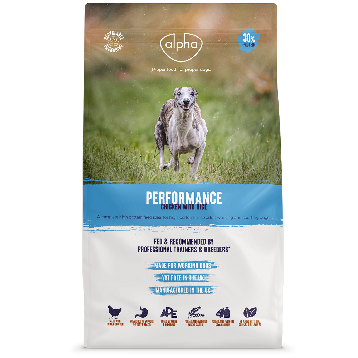 Alpha Performance is formulated without wheat gluten and has been designed to support speed, endurance, and strength in working and sporting dogs.