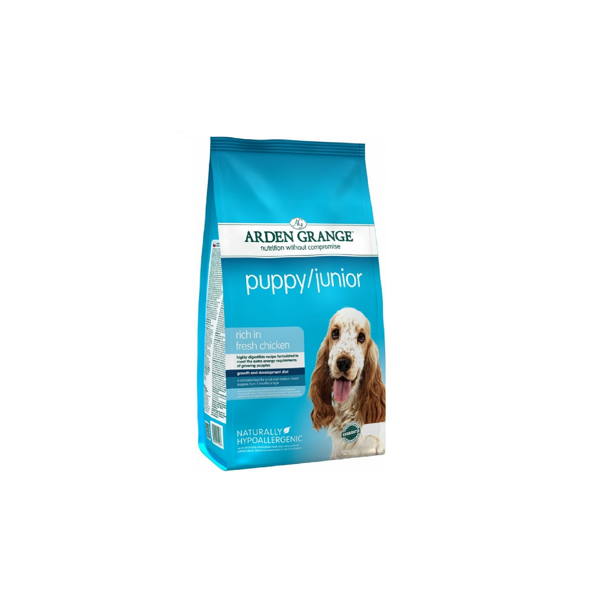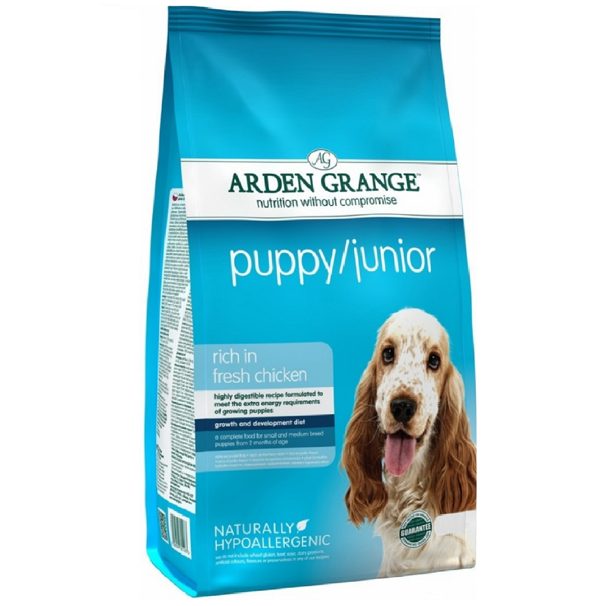 Arden Grange puppy/junior foods contain delicious fresh chicken for puppies and adolescent dogs. Both varieties have the optimal balance of vitamins and minerals to encourage steady and healthy growth and development. Puppy/junior diet can be fed from eight weeks of age until your puppy has reached full adult height, then move on to an adult variety.