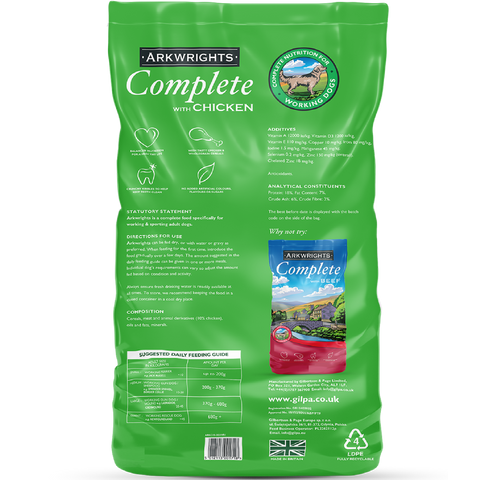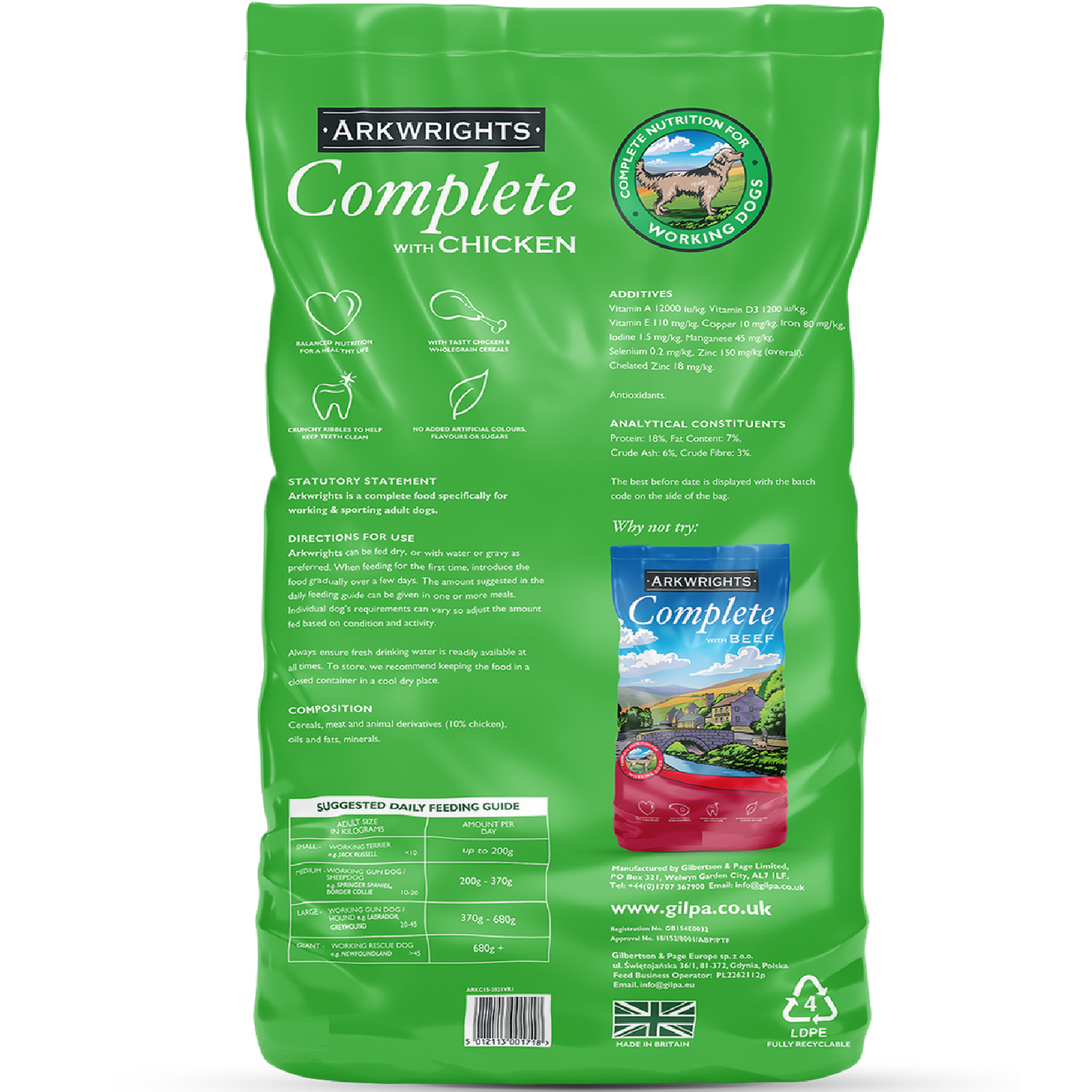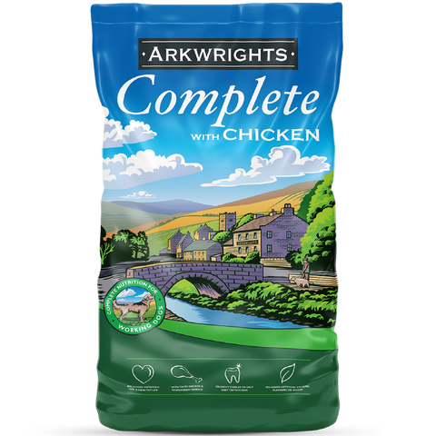 Arkwrights Complete with Chicken is a delicious dry dog food that provides a perfectly balanced diet for all adult working and sporting dogs — keeping them healthy in their active lifestyles! Produced with the utmost care to provide a balanced diet, our tasty kibble is made with the finest ingredients and contains everything dogs need to stay happy and healthy!.