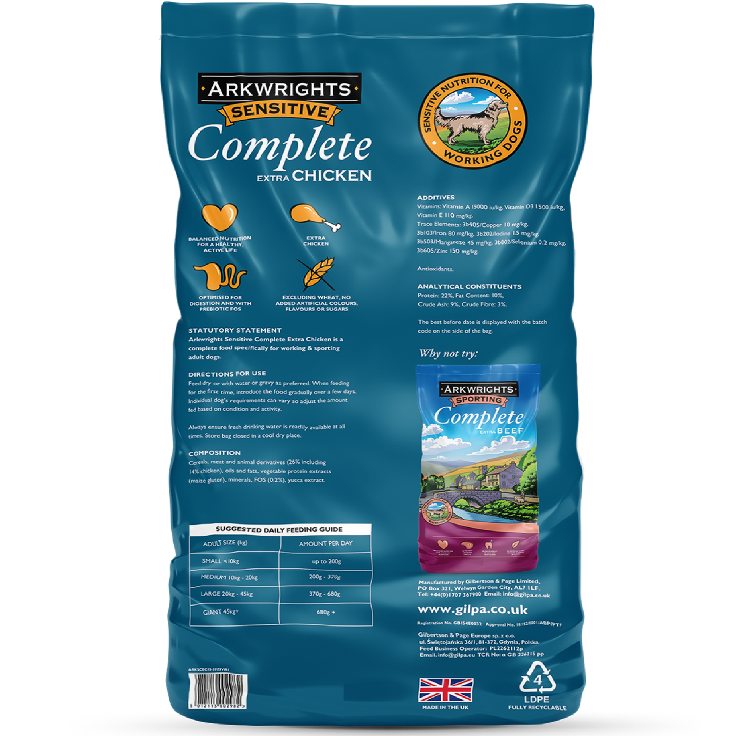 Arkwrights Sensitive is a perfectly balanced dry dog food for adult and senior dogs with sensitive stomachs. The wheat-free recipe is combined with prebiotics to promote healthy digestion. This delicious dry dog food provides a perfectly balanced diet for all adult working and sporting dogs — keeping them healthy in their active lifestyles.