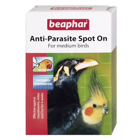 Anti-Parasite Spot-on contains ivermectin and is effective against roundworms, feather lice, red (blood) mites, feather mites, air sac mites and mange mites (scaly face) for up to 4 weeks after treatment.