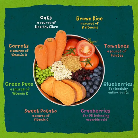Made from an easily digestible and natural blend of fresh potatoes, carrots, peas, tomatoes, berries, brown rice and more, this delicious meal is packed full of goodness and is entirely meat-free.