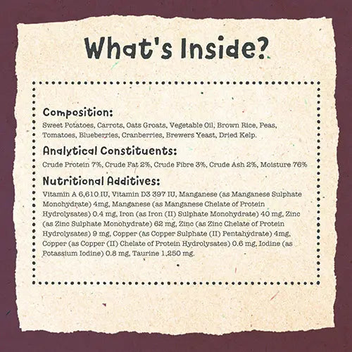 Sweet Potato, Carrots, Oat Groats, Vegetable Oil, Brown Rice, Peas, Tomatoes, Blueberries, Cranberries, Brewers Yeast, Dried Kelp.