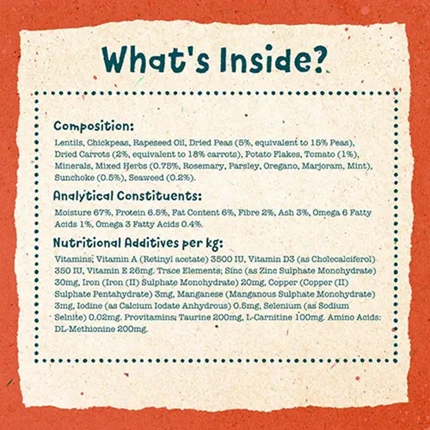 Lentils, Chick Peas, Rapeseed Oil, Dried Peas (5%, equivalent to 15% Peas), Dried Carrots (2%, equivalent to 18% Carrots), Potato Flakes, Tomato (1%), Minerals, Mixed Herbs (0.75%, Rosemary, Parsley, Oregano, Marjoram, Mint), Sunchoke (0.5%), Seaweed (0.2%).