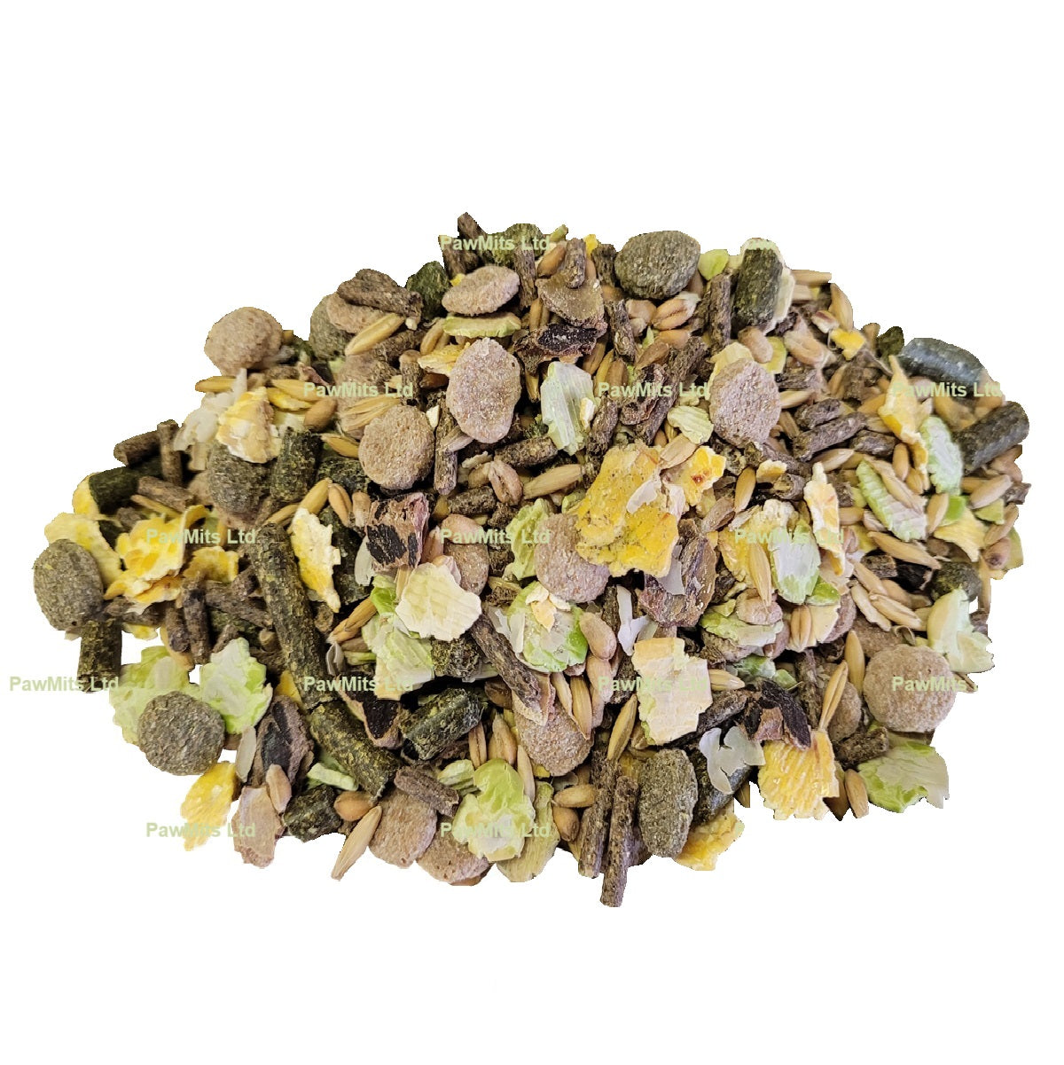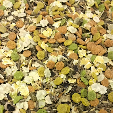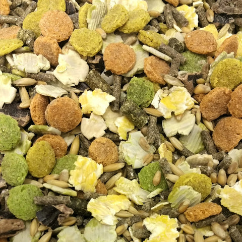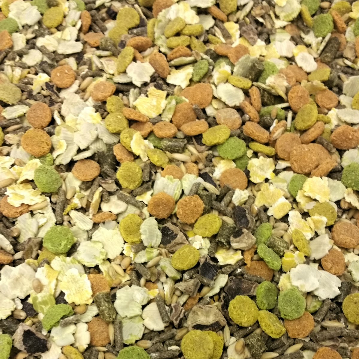 | Main Ingredients | Pellets, Corn, Veg, Grass, Locust Beans... |