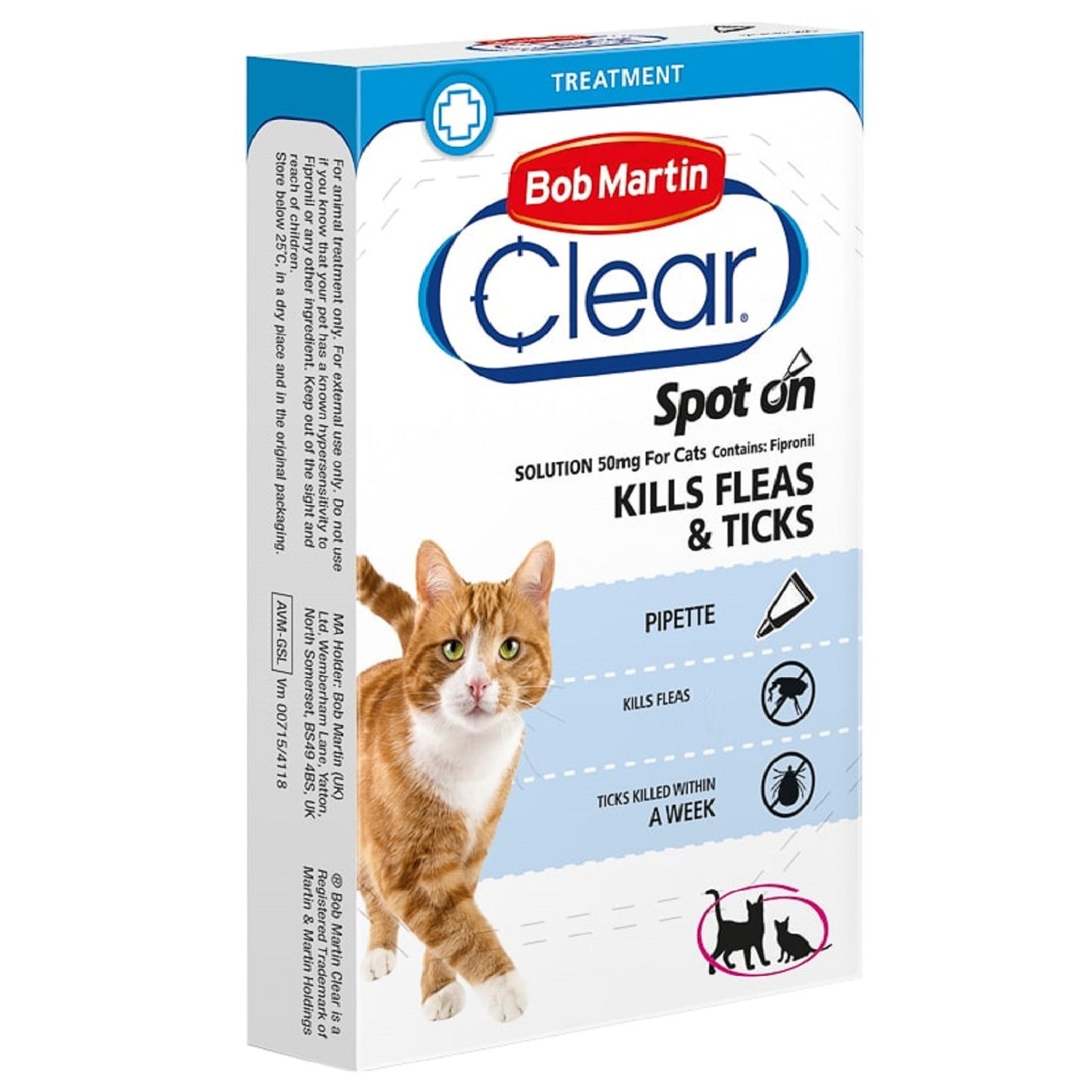 Bob Martin Flea Clear Spot On Solution 50mg for cats is for killing fleas on your cat. It is applied at the back of the cat’s neck and between the shoulders.