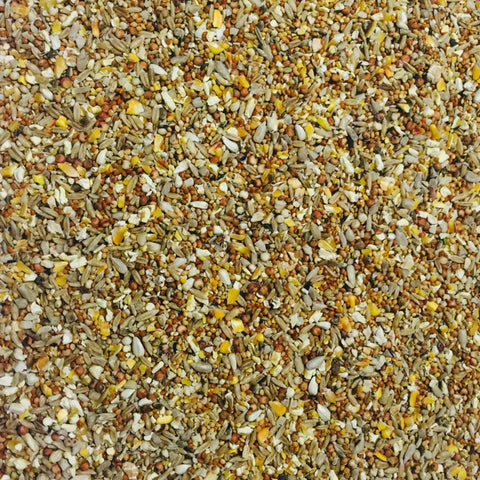 Kibbled Maize, Naked Oats, Red Dari, Red Millet, Yellow Millet, Kibbled Sunflower Hearts, White Dari, Canary Seed, Pinhead Oatmeal, Kibbled Peanuts, Safflower Seed, Panicum Millet, Hempseed, Japanese Millet and Nyjer Seed.
