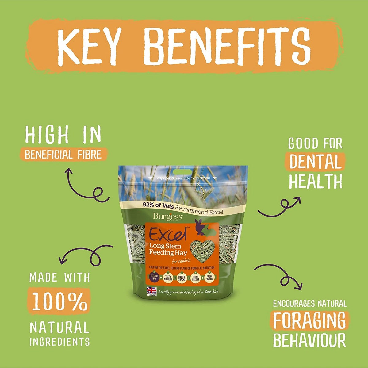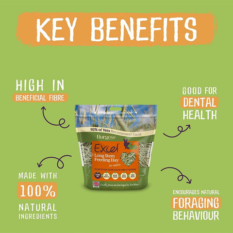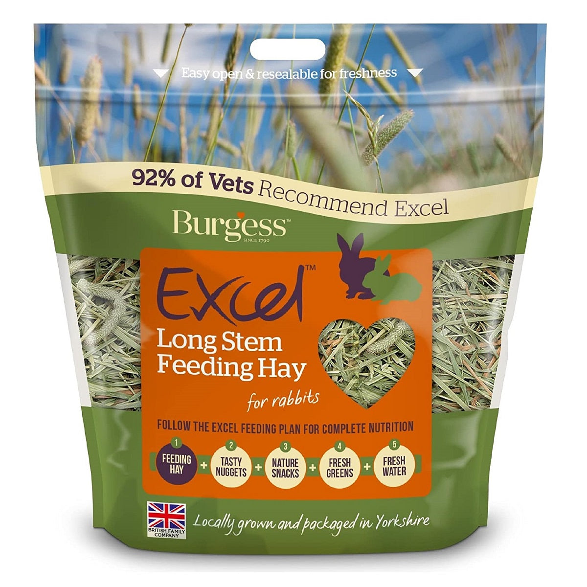 Bedding hay is good to sleep on but lacks the nutritional values of feeding hay. Burgess Excel Long Stem Feeding Hay is Timothy Hay grown on a Yorkshire farm, cut at the right time and dried within 48 hours.