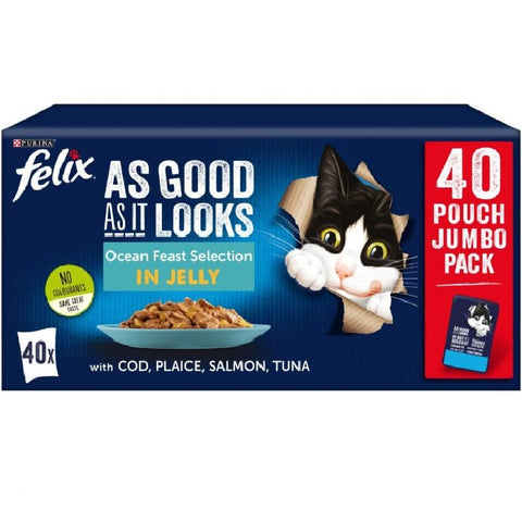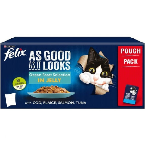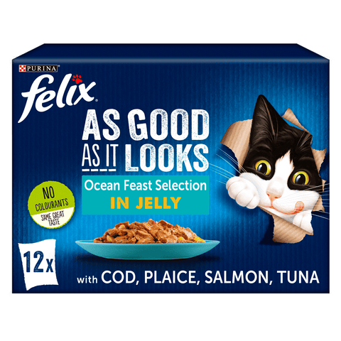 The perfect variety pack for fish-loving felines! Our delicious FELIX As Good As It Looks Adult Cat Ocean Feasts in Jelly include the mouth-watering tastes and textures of cod, plaice, salmon and tuna.