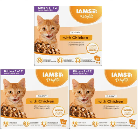 IAMS Delights with Chicken in Gravy is a 100% complete and balanced premium wet food for kittens. Each recipe is lovingly prepared with high quality ingredients and offers an irresistible taste to promote healthy vitality and delight your cat. Cats can absorb nutrients from their food which helps them to look and feel great on the inside and out. IAMS Delights provides key nutritional benefits for each life stage. Kitten diets contain high quality animal protein to help build muscles.