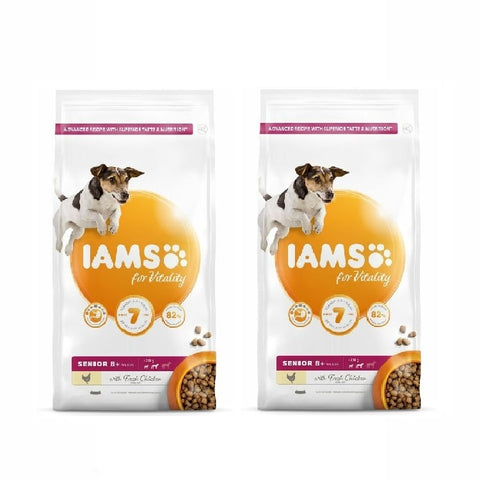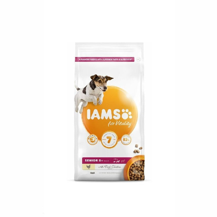 IAMS for Vitality for small and medium breed senior dogs is a 100% complete and balanced expert nutrition for them to enjoy and thrive on. Our new and improved tasty senior recipe with fresh chicken is based on high quality animal protein, carefully selected to support your dog’s 7 signs of healthy vitality. Strongly believing that dogs should be healthy, active and full of vitality, our tasty recipe contains 82% animal protein (out of total protein).