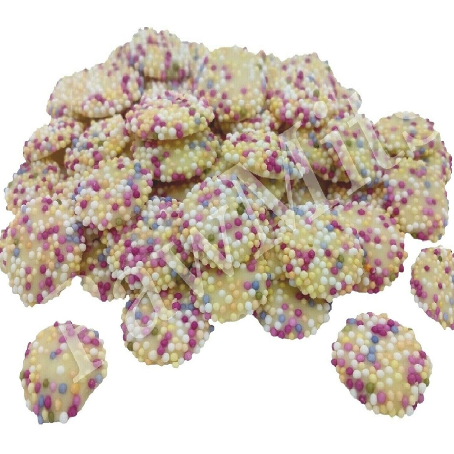 Vegetable fat, Wheatflour, Starch, Glucose syrup, Emulsifier, Soya lecithin, Flavourings, Colours, Glazing agent, Beeswax..