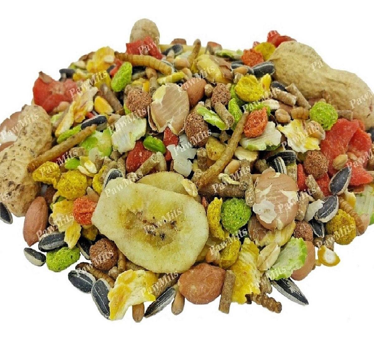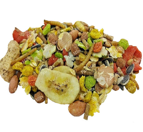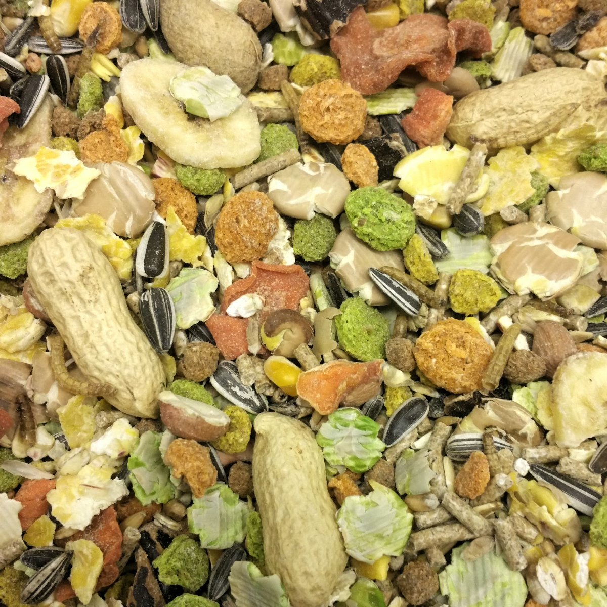 Concentrate nuts (wheatfeed, extracted sunflower, straw, sugarbeet, calcium carbonate, molasses, grassmeal, sodium chloride, vegetable oil, , vitamin & trace element premix), kibbled maize, flaked maize, flaked beans, flaked peas, whole wheat, wheat extrusions, sunflower seeds, locust bean extrusions, flaked naked oats, dried carrot, dried banana, peanuts, mealworms, 100% natural herb blend, soya oil.