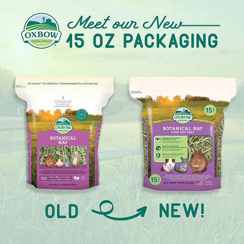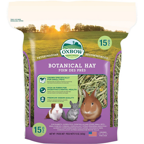 Oxbow Botanical Hay is an enticing blend of Western Timothy Hay with a rich array of herbs including - chamomile, lemon balm, lavender and red clover blossoms.