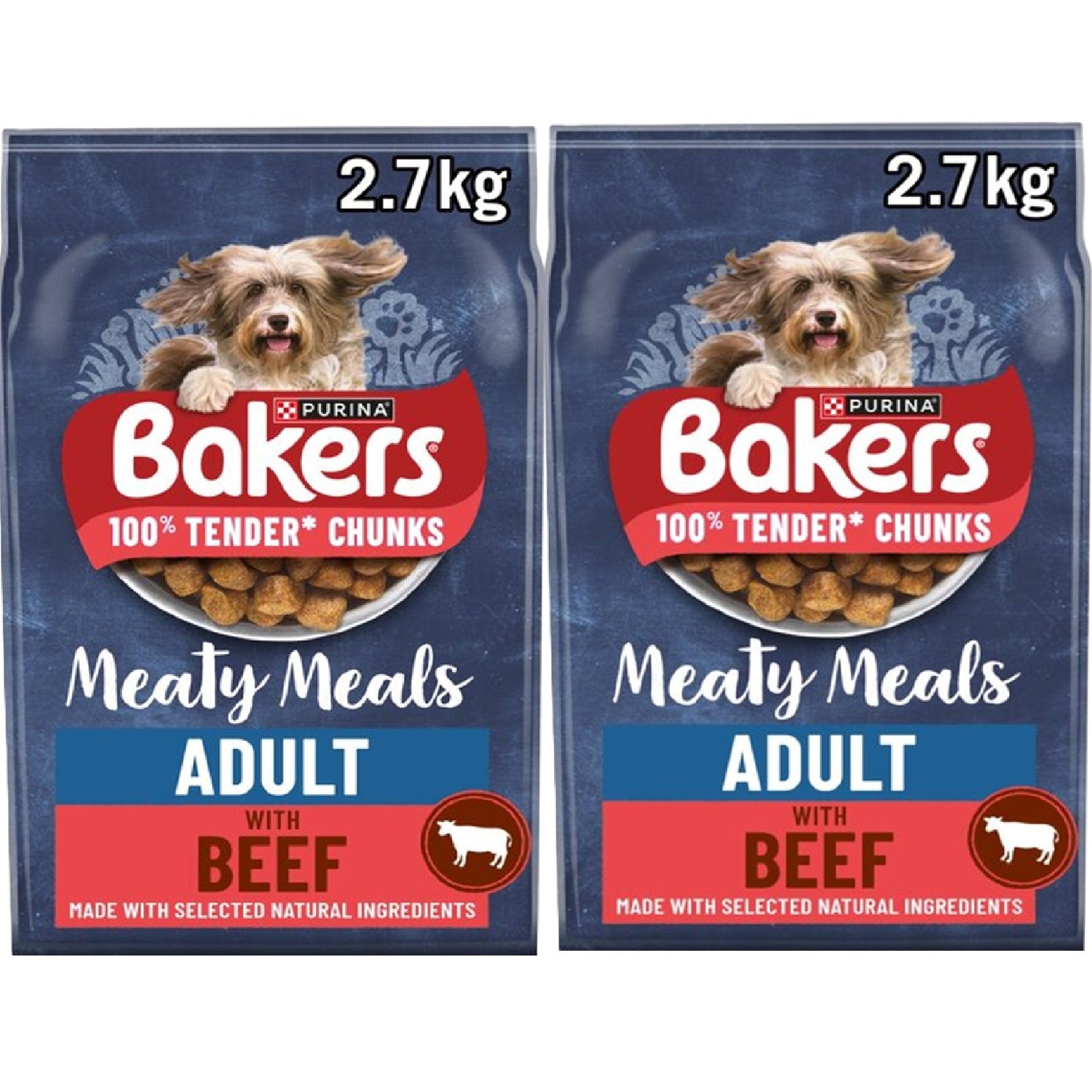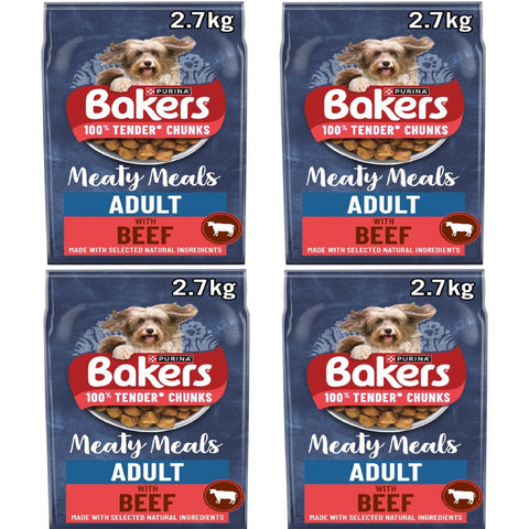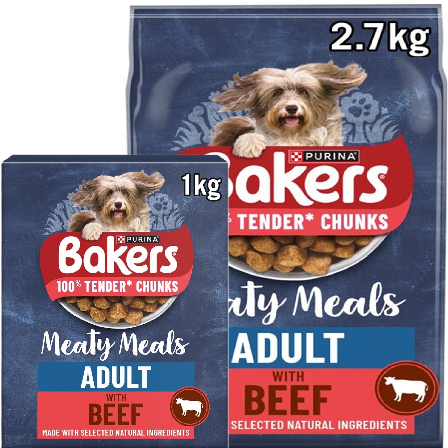 BAKERS Meaty Meals dry dog food consists of tender* chunks with tasty beef *softness varying with time. 100% complete, this recipe is a complete nutritional balance for your Adult dog's daily needs, keeping your dog's tail wagging for more.