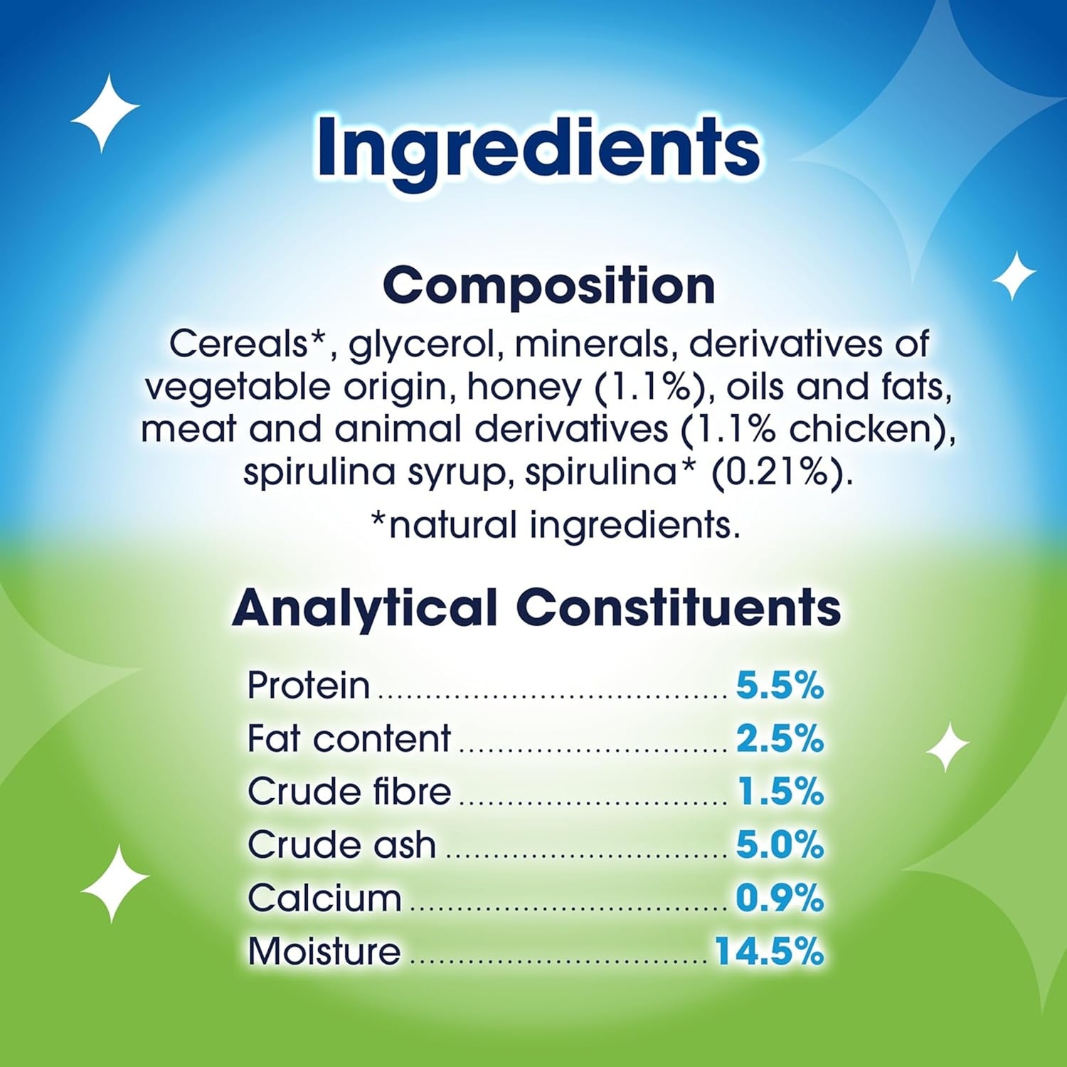 Cereals*, Glycerol, Minerals, Derivatives of vegetable origin, Honey (1.1%), Oils and fats, Meat and animal derivatives (1.1% chicken), Spirulina syrup, Spirulina* (0.21%). *natural ingredients.