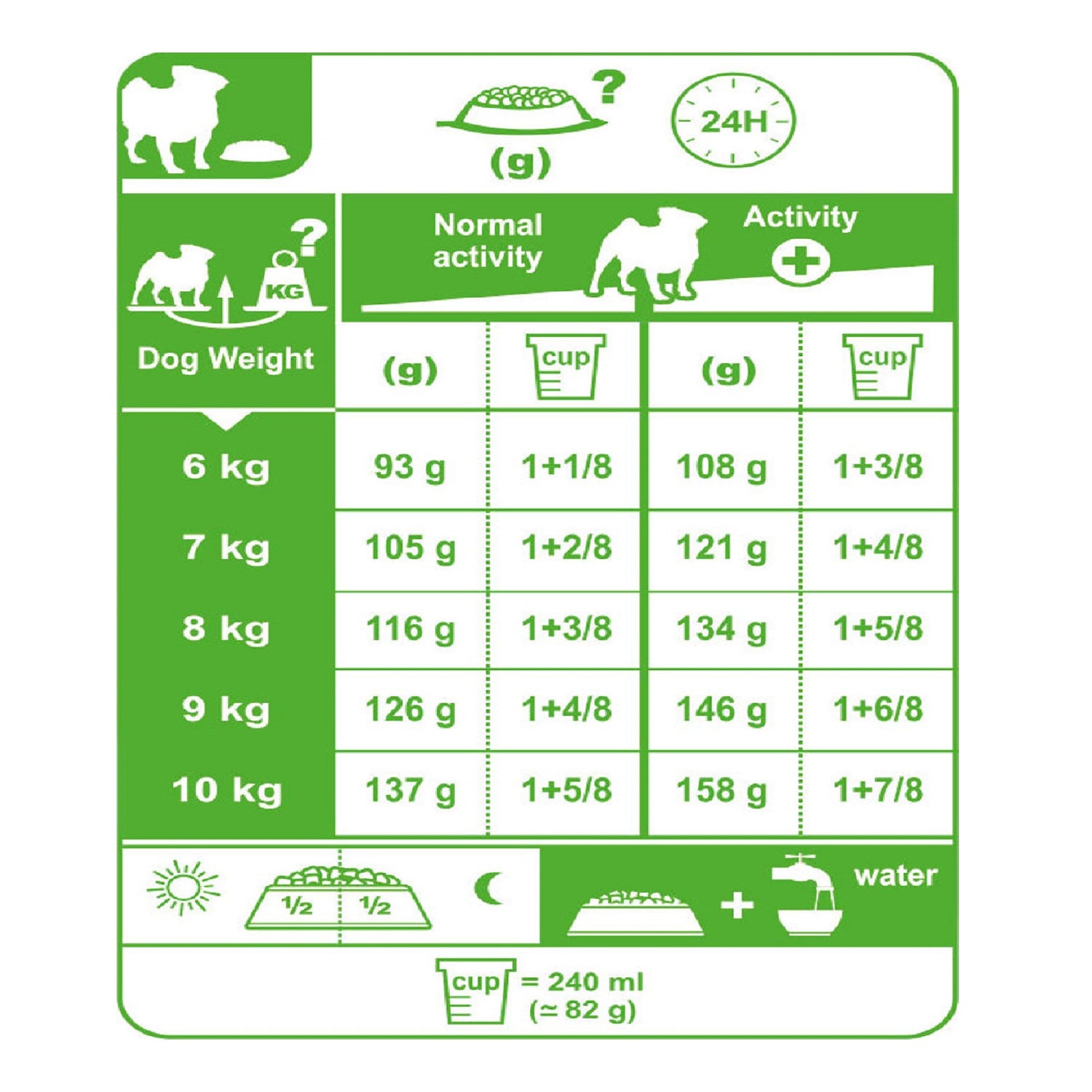 Exclusive kibble design: special brachycephalic jaw: A kibble exclusively designed to make it easier for the Pug to pick up and to encourage him to chew.