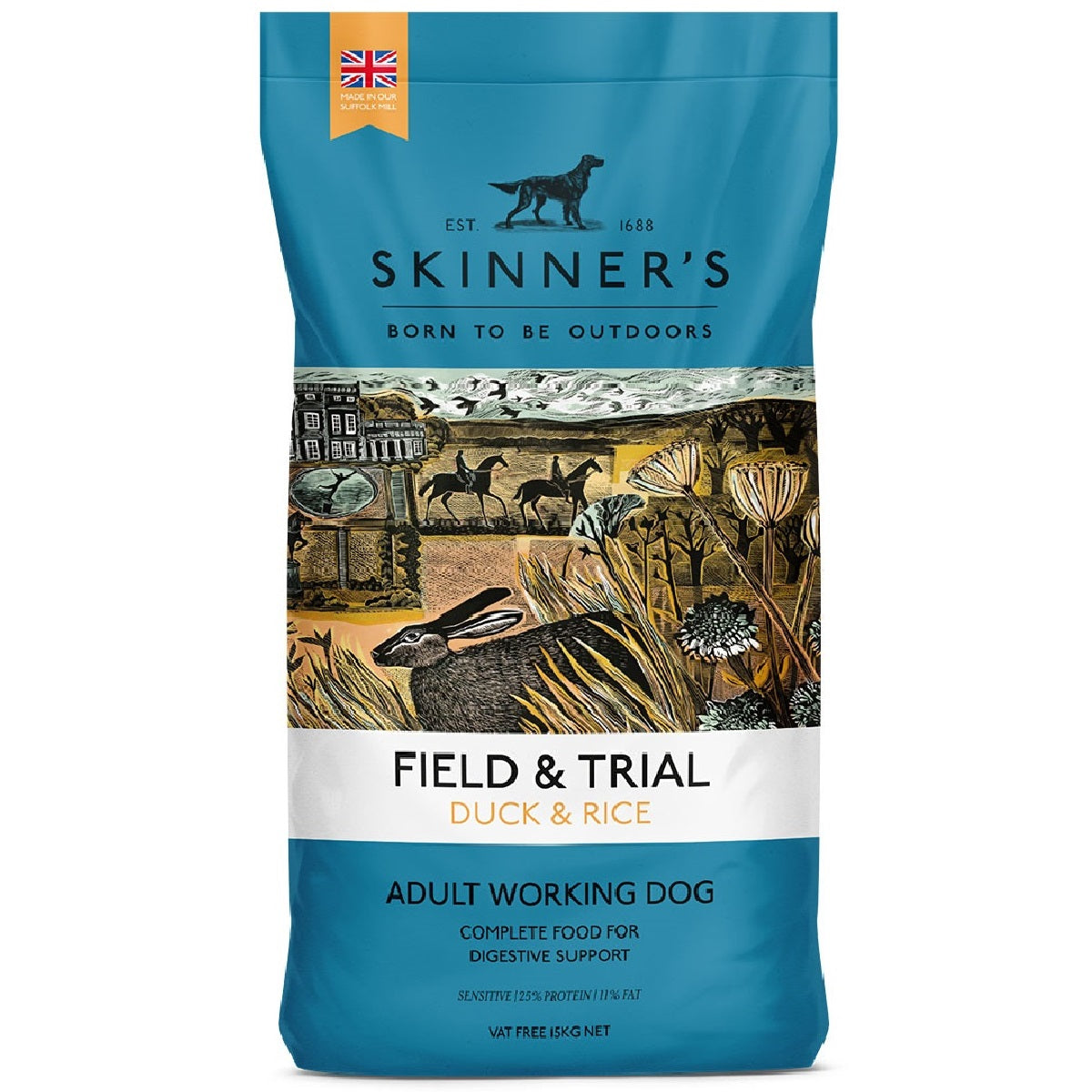 Skinner’s Field & Trial Duck and Rice has been carefully developed to include a protein level of 25% and a fat level of 11% to support the energetic requirements of a range of active dogs, such as working gundogs, agility dogs and active pet dogs. With protein being provided from digestible duck meal, to support muscle integrity and development, and fat to support moderate performance output, Skinner’s Field & Trial Duck and Rice is an ideal choice for a range of dogs. These factors, along with rice supplying digestible carbohydrate as an energy source, means that Skinner’s Field & Trial Duck and Rice constitutes a diet to support the day-to-day requirements of active dogs.