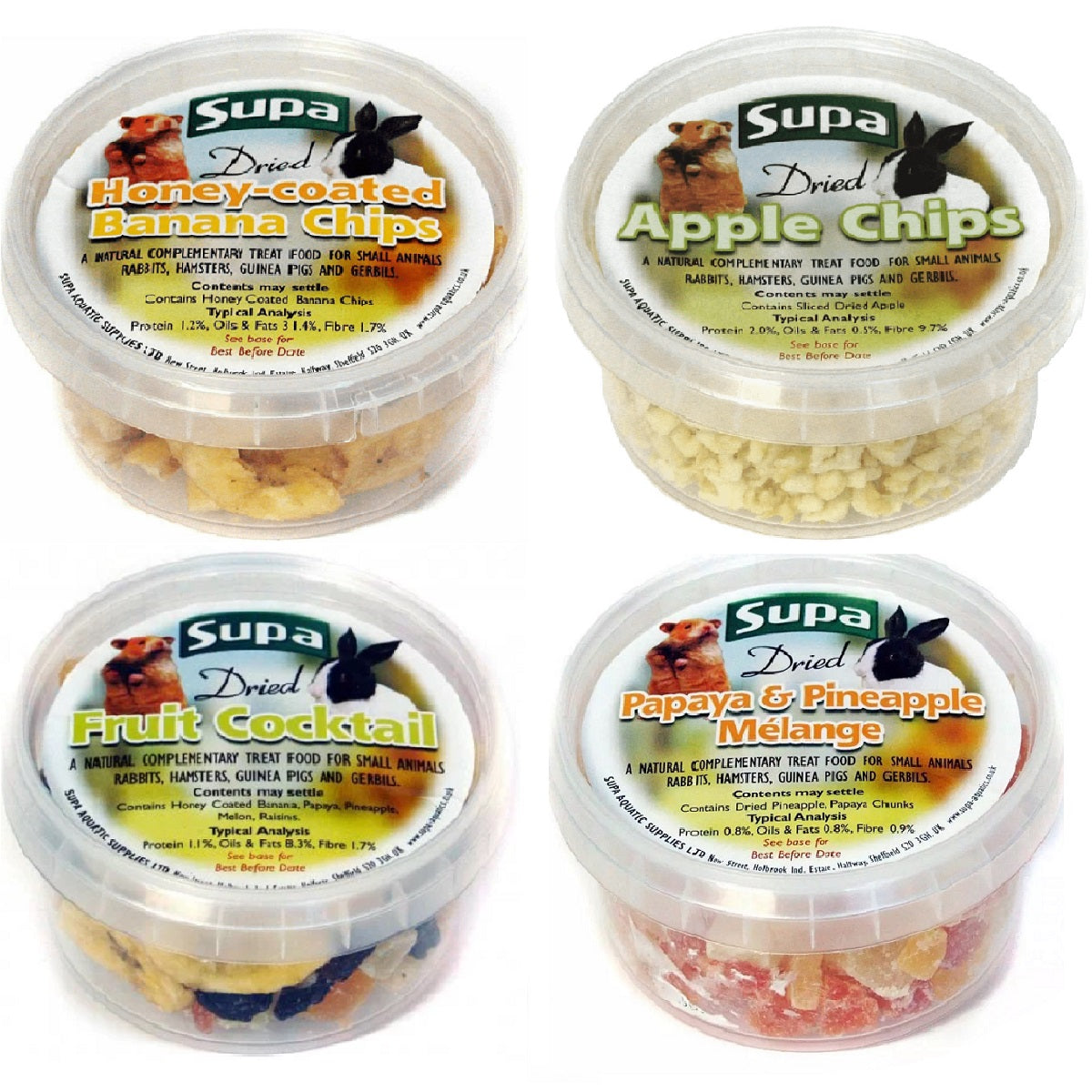 Available in this range of Small Animal treats are Apple Chips, Papaya & Pineapple Melange and Fruit Cocktail.