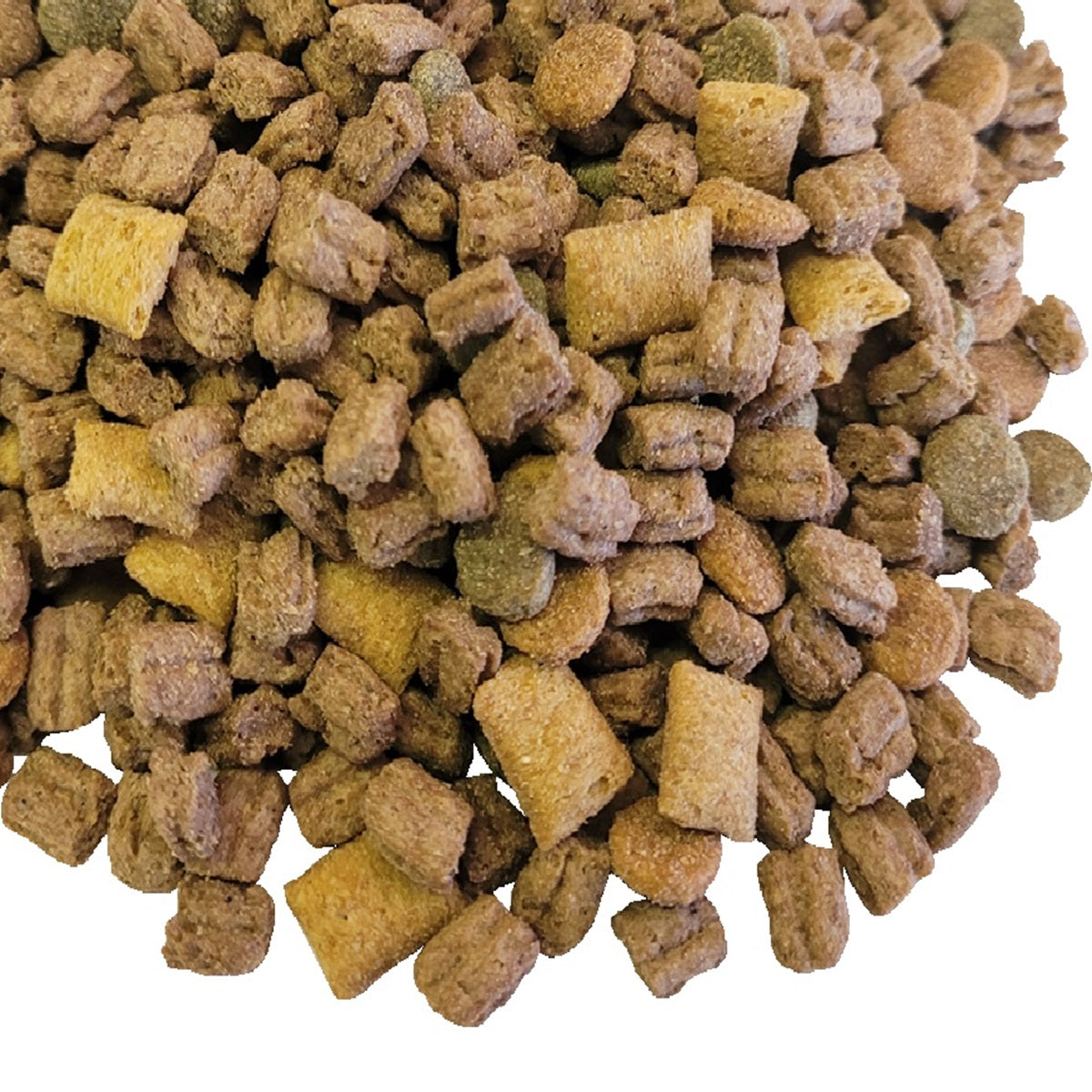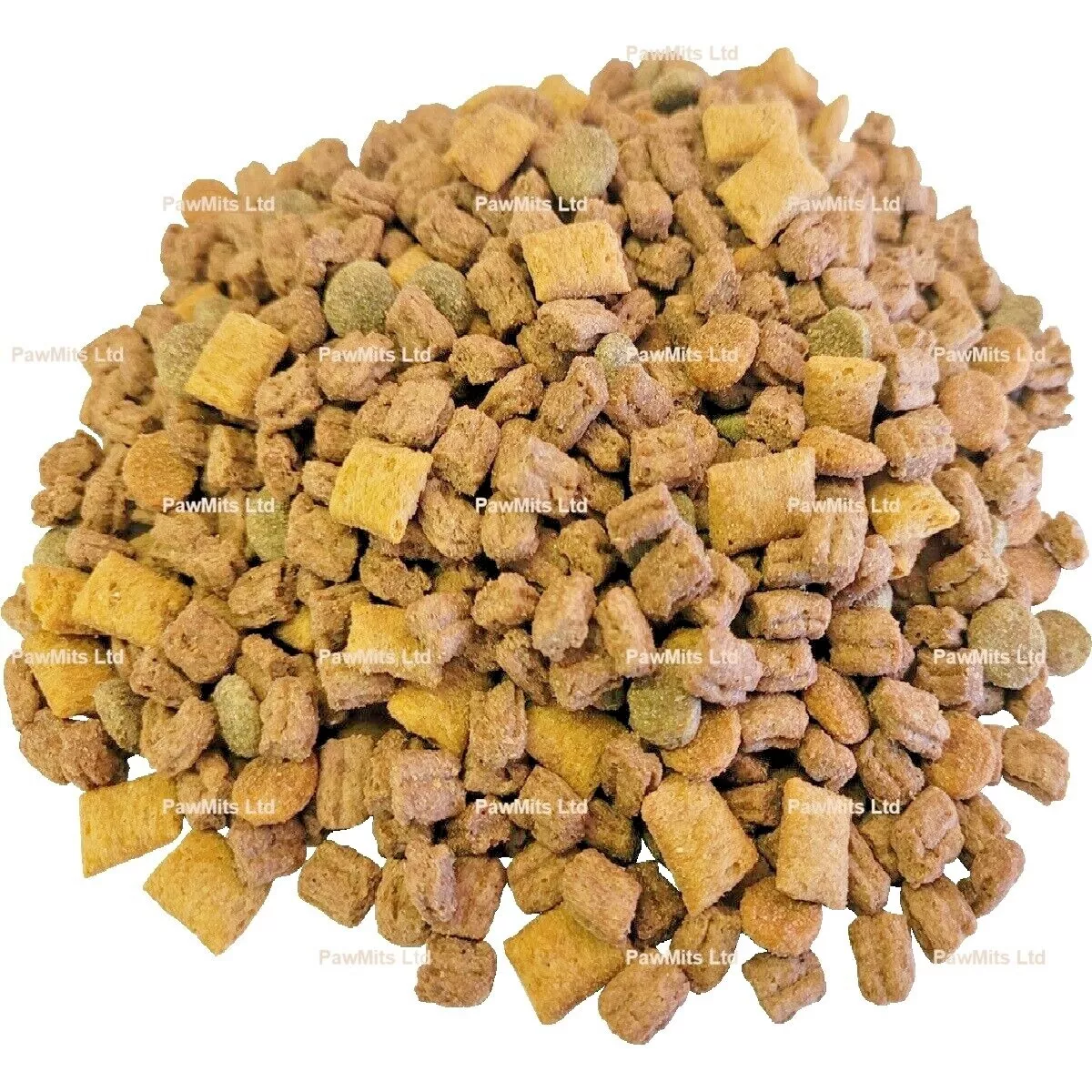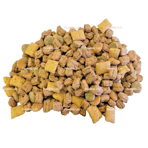 Cereals (min 4%), Meat and Animal Derivatives (min. 4% Chicken in the Light Brown Kibbles, min. 4% Meat in the Meaty Nuggets Filling), Vegetable Protein Extracts, Oils and Fats (min. 0.1% Sunflower Oil), Derivatives of Vegetable Origin, Minerals, Vegetables (min. 4% Carrots in the Orange Kibbles, min. 4% Peas in the Green Kibbles).