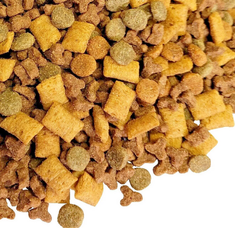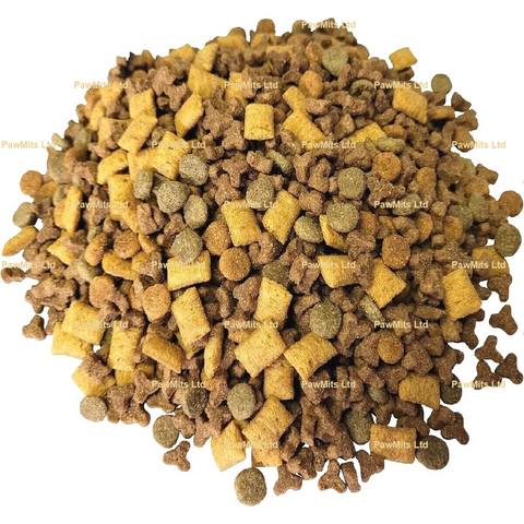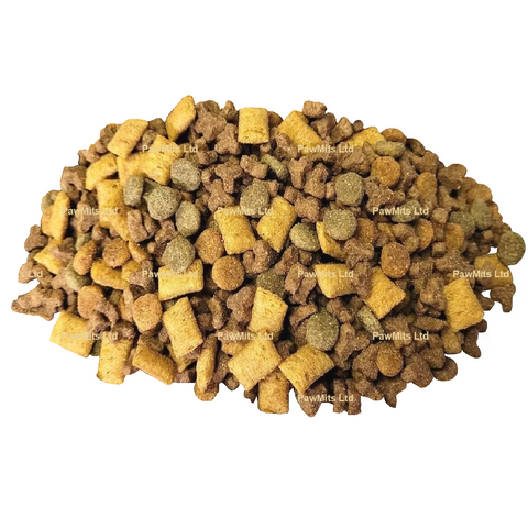 Cereals, Meat and Animal Derivatives (min. 4% Chicken in the Brown Kibbles, min. 4% Meat in the Meaty Nuggets Filling), Vegetable Protein Extracts, Oils and Fats, Derivatives of Vegetable Origin, Minerals, Vegetables (min. 4% Carrots in the Orange Kibbles, min. 4% Peas in the Green Kibbles), Milk and Milk Derivatives (min. 4% Milk in the Nuggets).